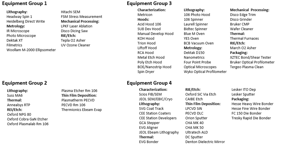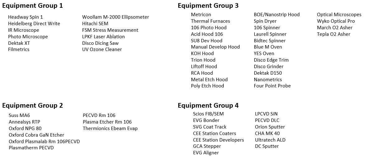 The NNF has separated the tool set into four different groups for usage rates. The equipment split is as follows: